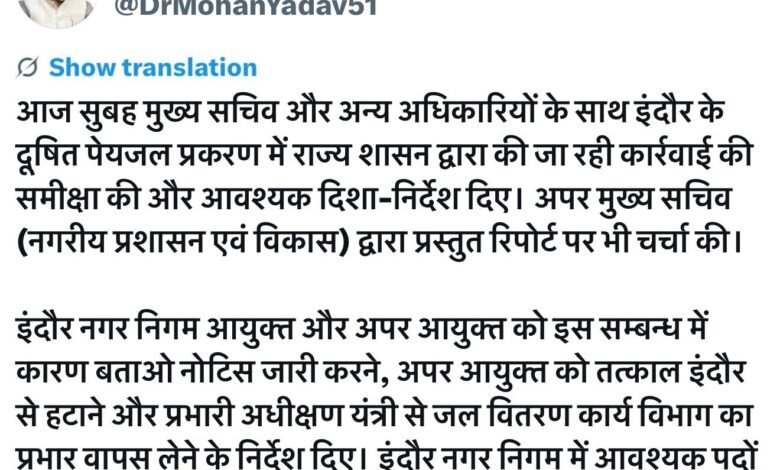 इसके अलावा, मुख्यमंत्री ने इंदौर नगर निगम में रिक्त आवश्यक पदों पर तत्काल नियुक्ति सुनिश्चित करने के निर्देश दिए हैं, ताकि भविष्य में इस तरह की स्थिति दोबारा उत्पन्न न हो और जल वितरण व्यवस्था सुचारू रूप से संचालित की जा सके।